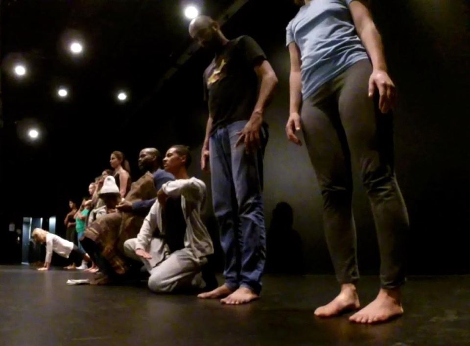 group ← Previous Next → In a dark black box theatre, a line of people stand, sit, kneel. The anle of the photo is taken from low to the ground. People look like living statues, with serious expressions.